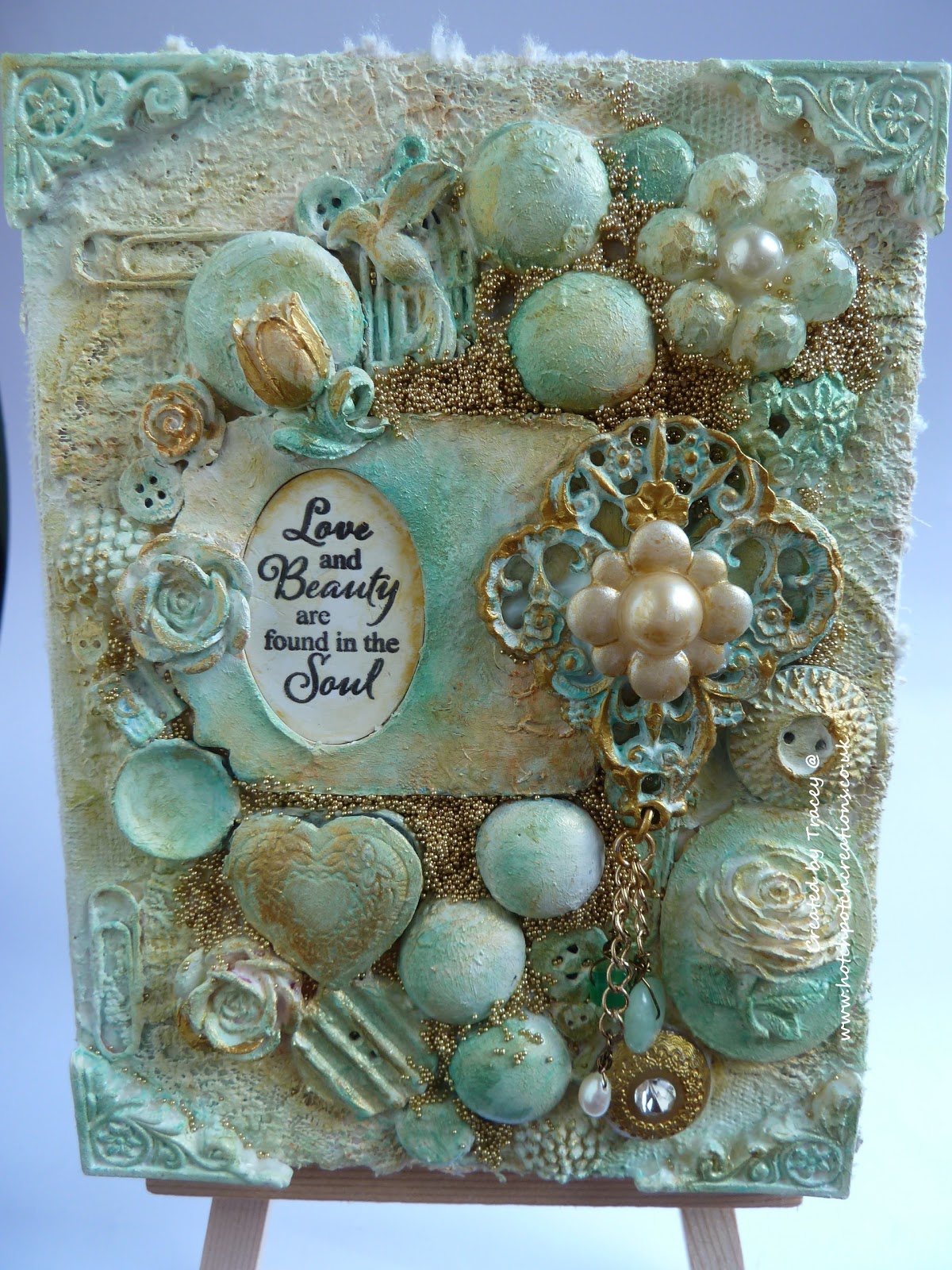 Using a 5x7 Lace covered canvas I glued on the oddments along with an embossed and stamped aperture tag. When dry the whole canvas was painted in white Gesso repeating the process until the embellishment were completely covered.I gradually added colour using water soluble wax pastels activating with water and reapplying when dry.